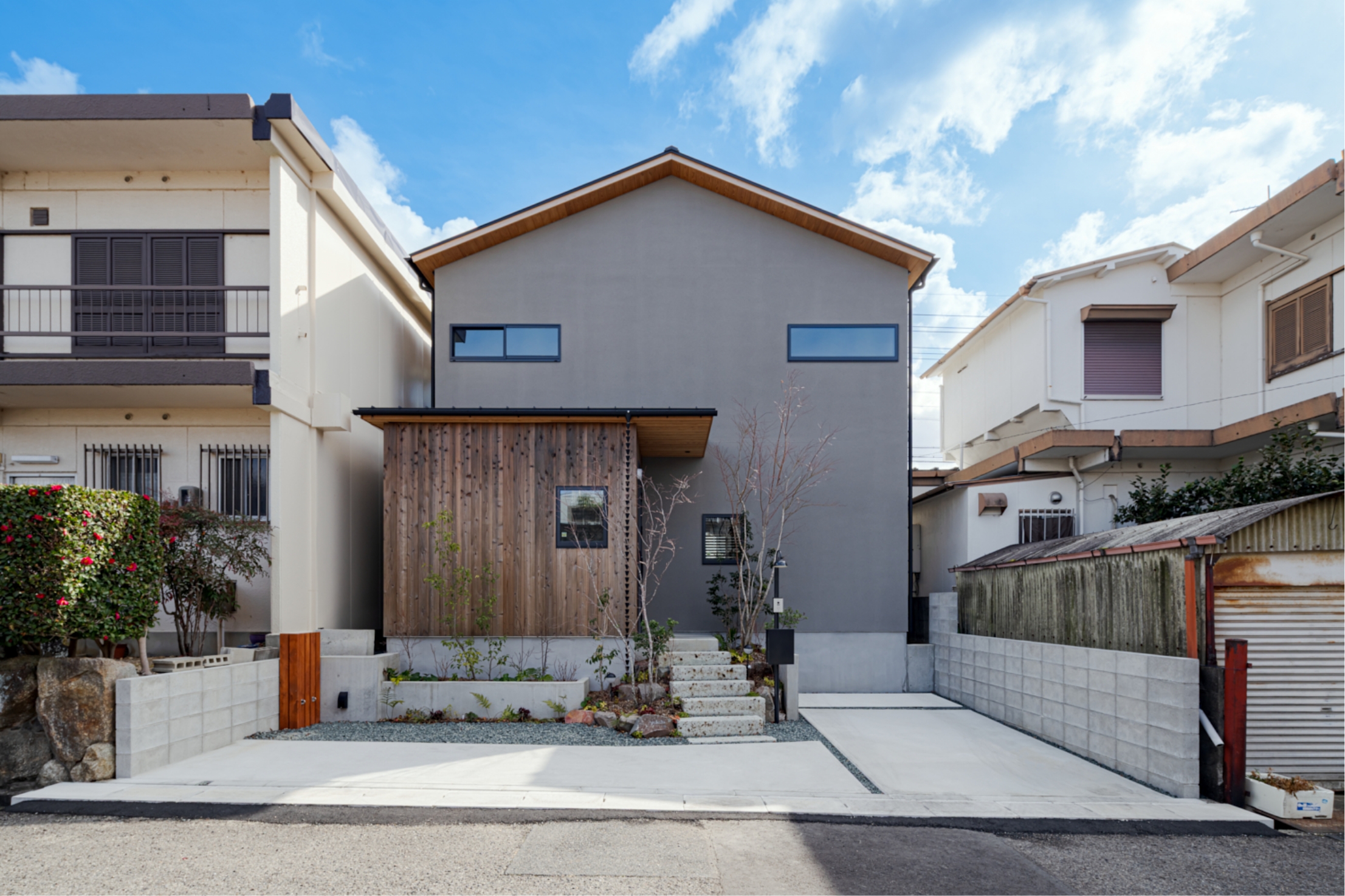 この敷地特性を活かしながら、住宅街の中でも視線を気にせずプライバシーを確保しながらも閉鎖的にならない、内外の繋がりを感じられる空間をつくりたいと考えた。