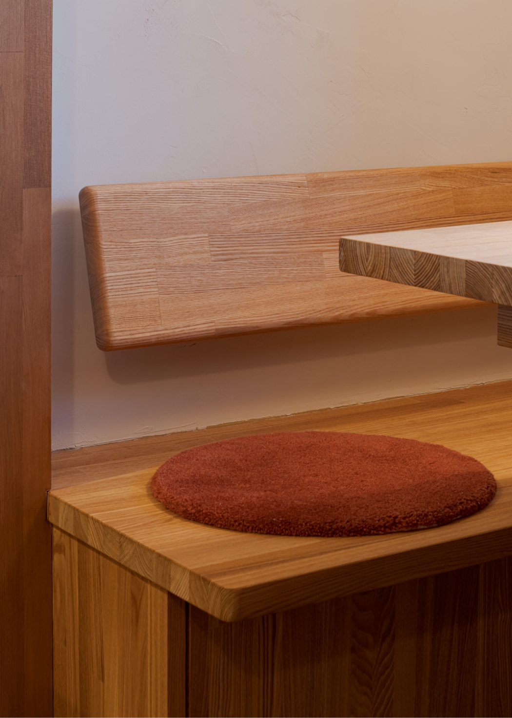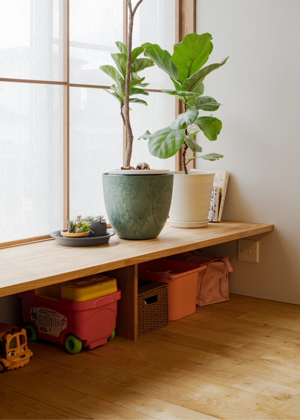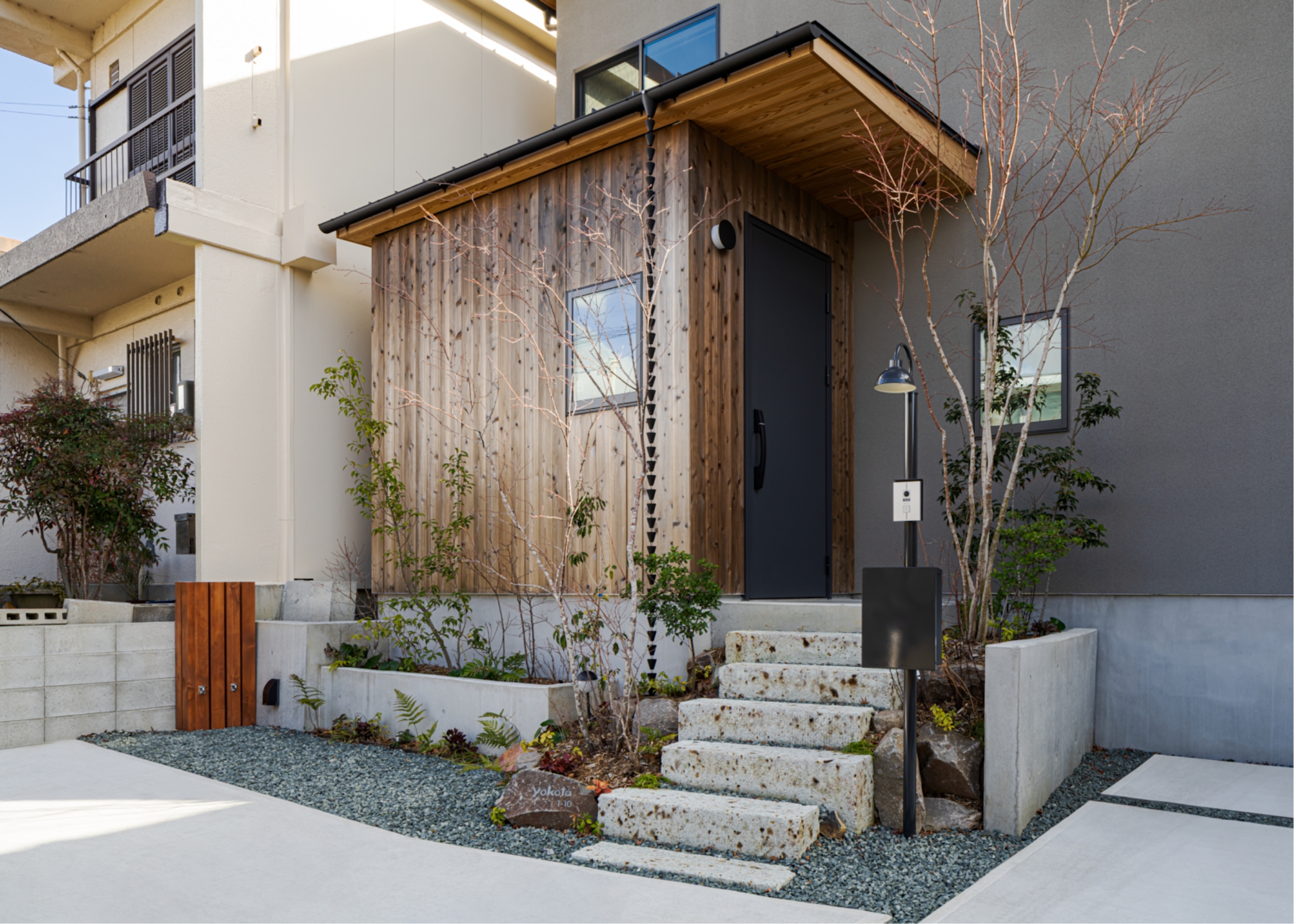 敷地の北側は生活道路に面しており、歩行者からの視線が通ることから開口部を小さく絞った。小さく絞った開口部から切り取られる景色を楽しめるよう、北側には季節の変化を楽しめる樹種を多く配置し、ヌックと繋げることで読書や食事の時間に彩りを加えられるよう計画した。
